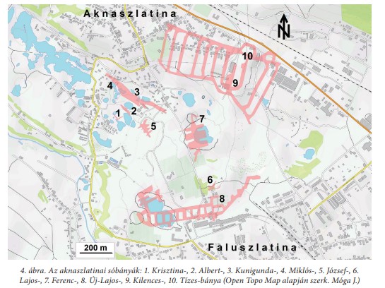 A Máramarosi-medencében, a ma Romániához tartozó Máramarosszigettől (Sighetu Marmației) északra a Tisza völgyében, de már Ukrajna területén egy kavicsterasz alatt fekszik a mintegy 1,9 km2 kiterjedésű, körte alakú aknaszlatinai sódóm. A Tisza dél felől széles kanyarral megkerüli ezt a felemelkedő sódómot (sódiapírt), amelynek hosszabb tengelye körülbelül 2400 m, legnagyobb szélessége körülbelül 1300 m, a mélysége pedig több mint 600 m (3. ábra). A sódóm eltemetett helyzetben van, átlagosan 25–30 m vastagságban kaviccsal, homokkal és néhány méter vastag vízálló sóagyaggal (pallaggal) fedve (Szokol P. 1879, Cholnoky J. et al. 1926, Schmidt Eligius R. 1941, Réthy K. 2010). A korszerű sóbányászat a 18–19. század fordulóján kezdődött Máramarosban, legfontosabb helyszínei Rónaszék, Aknasugatag és Aknaszlatina voltak. A bányák kincstári tulajdonban voltak, azokat tisztjei vezetésével a kamara művelte, a só termelése és kereskedelme pedig kincstári monopóliumnak számított. Az intenzív sóbányászatnak köszönhetően az 1860-as években a magyarországi termelésnek több mint 50%-a került ki a máramarosi bányákból, ezen belül az aknaszlatinai sóbányák az országos kitermelés 23%-át adták. 1880 után a bányaigazgatóság Aknaszlatinán működött, és mind Rónaszéket, mind Aknasugatagot annak rendelték alá. Aknaszlatinán az ipari méretű sóbányászat 1778-ban kezdődött. Összesen 10 sóbányát nyitottak meg (4. ábra), abból kilencben termeltek; napjainkra azonban egy sem maradt meg, mindegyik vízbetörés áldozatául esett. Az alábbiakban olvasható a sóbányák neve a bányák megnyitásának és pusztulásának időpontjával, valamint néhány rájuk jellemző tényező megemlítésével: