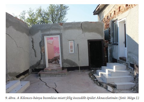 Másrészt a természetes hatásokra és emberi beavatkozásokra nagyon érzékeny sókarszt a meggondolatlan földhasználat, a nem megfelelő hasznosítás nyomán elszabaduló antropogén felszínformáló folyamatok iskolapéldája, ahol a káros hatások megismerése, megelőzése, megfékezése és a károk mérséklése napjaink fontos feladatai közé tartozik. Évek óta követjük, illetve vizsgáljuk az Aknaszlatinán végbemenő, katasztrofális következményekkel járó változásokat, a sóbányák vízbetörések következtében lejátszódó beomlását és az épületek ezek hatásárára bekövetkező károsodását, pusztulását (9.ábra). Az egykori tíz bánya sok-sok km-nyi járatrendszere, amely még ma is behálózza a sódómot, mint egy időzített bomba ketyeg, szó szerint aláaknázva és veszélyeztetve a település házait. Nehéz megjósolni, hogy beomlásuk mikor és hol fog ismételten pusztulást okozni. A sóbányák pusztulása súlyos társadalmi problémákat is eredményezett, hiszen megszűnt a helybeliek megélhetését biztosító sókitermelés és – bár ebben más okok