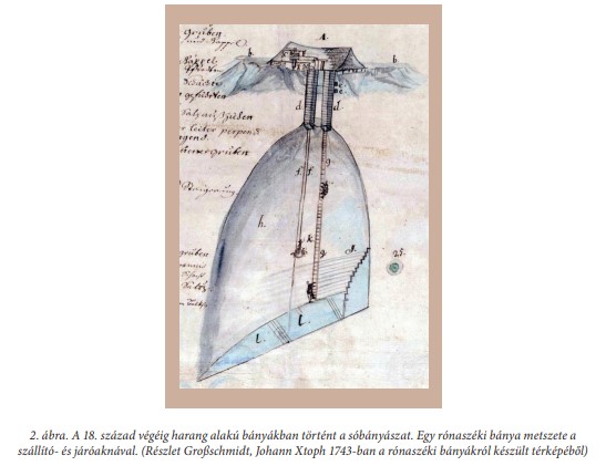 A rónaszéki sóbányászat eredete a legrégibb időkre vezethető vissza. Oklevelek tanúsítják, hogy az ottani sóbányák Ulászló király uralkodása alatt a 15. században már művelés alatt álltak. Nagyobb szabású bányaművelés 1674-es évben vette kezdetét. Aknasugatag az 1325-ös év óta jelentős sókitermelő-helyként számon tartott település. Aknaszlatinán az első bányát valószínűleg a 13. század elején nyitották meg. IV. Béla leánya, Kinga (vagy más néven Kunigunda) 1239-ben Boleszláv lengyel királyhoz ment férjhez, és egy Aknaszlatinán és a lengyelországi Wieliczkán fennmaradt legenda szerint nászajándékul a király leányának ajándékozta a máramarosi sóbányákat. A királynő Lengyelország felé menve, útját megszakítva látogatta meg a szlatinai sóbányát. A Kunigunda-bánya neve állítólag e látogatás emlékét őrzi (Lukács K. – Lukács J. 1999) A legrégibb időkben csak külszíni fejtéssel termelték a sót, a sókibúvások anyagát fejtették, később pedig ácsolattal védett aknák segítségével jutottak el a sótesthez. A bányák vízbetörés elleni védelmét gondosan megtervezték, ami egyrészt a felszíni vizek elleni szigetelést, másrészt a beszivárgó vizek elvezetését jelentette. A bejárati aknát pár méterrel a tiszta sóban még tovább mélyítették, majd harang alakúan kiszélesítették. A sótestbe mélyített harang vagy csúcsíves boltozatok kör vagy ellipszis szelvényűek voltak, átmérőjük több tíz méter volt, mélységük pedig akár a 150 métert is elérte. A kitermelt sótömbök szállítása lójárgánnyal történt, amit a szállítóaknában alakítottak ki. A darabos sót kenderkötélből készült hálókban emelték a felszínre. A sóbányászok az ún. járóaknában szabadon felfüggesztett kötélhágcsón közlekedtek (Schmidt Eligius R. 1941, Réthy K. 2010, 2. ábra)